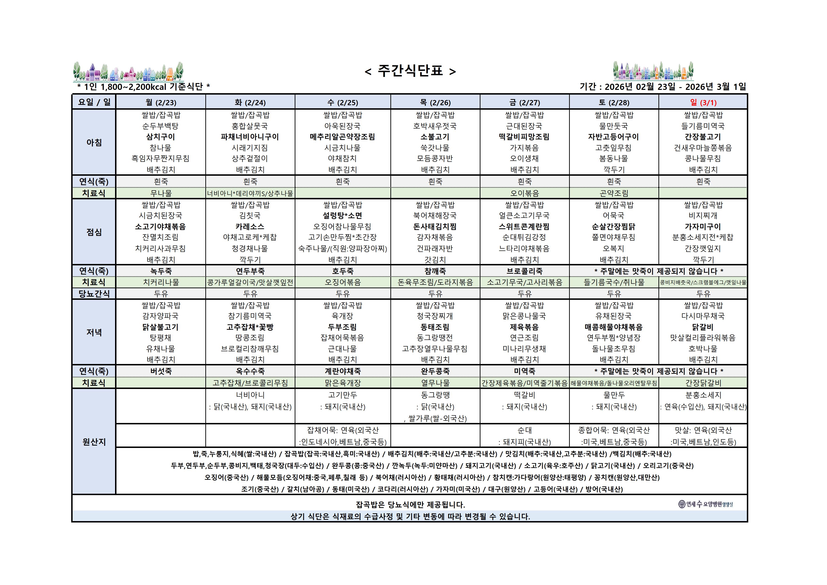 2026년 2월 4주차 주간식단표(26.02.23 - 26.03.01) 페이지 정보 작성자 최고관리자 댓글 0건 조회 777회 작성일26-01-12 11:16 본문 * 잡곡밥은 당뇨식에만 제공됩니다. * 상기 식단은 식재료의 수급사정 및 기타 변동에 따라 변경될 수 있습니다. 목록 댓글목록