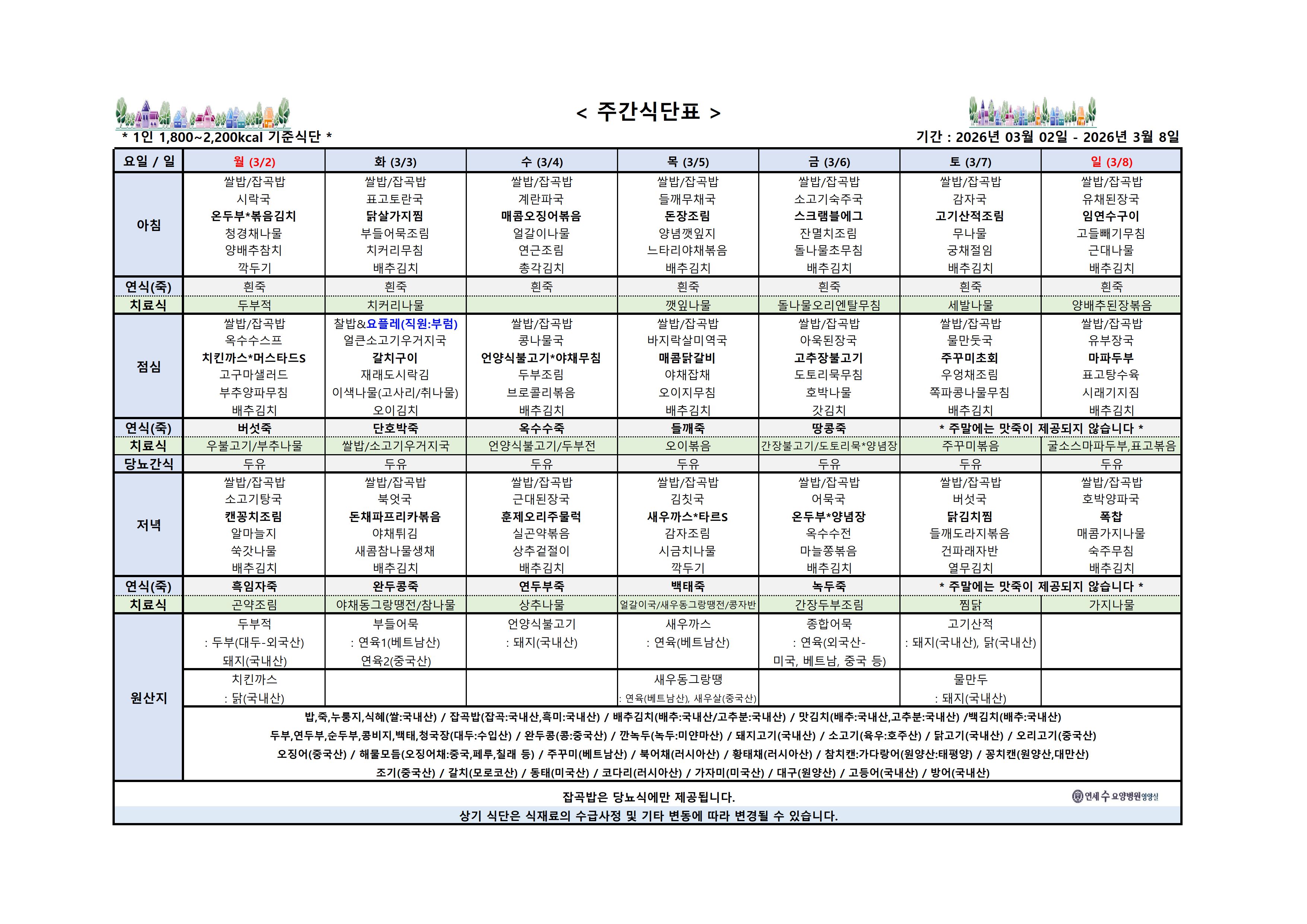 2026년 3월 1주차 주간식단표(26.03.02 - 26.03.08) 페이지 정보 작성자 최고관리자 댓글 0건 조회 837회 작성일26-01-12 11:16 본문 * 잡곡밥은 당뇨식에만 제공됩니다. * 상기 식단은 식재료의 수급사정 및 기타 변동에 따라 변경될 수 있습니다. 목록 댓글목록